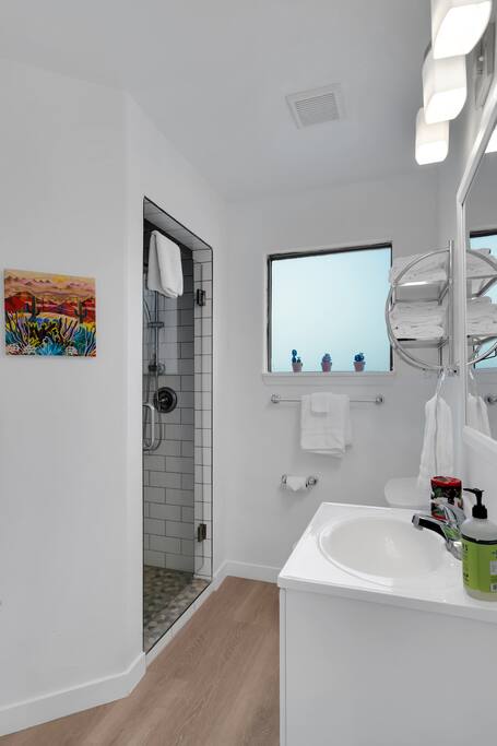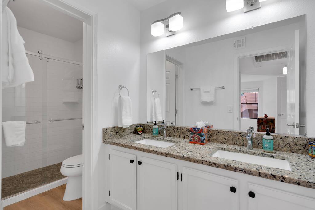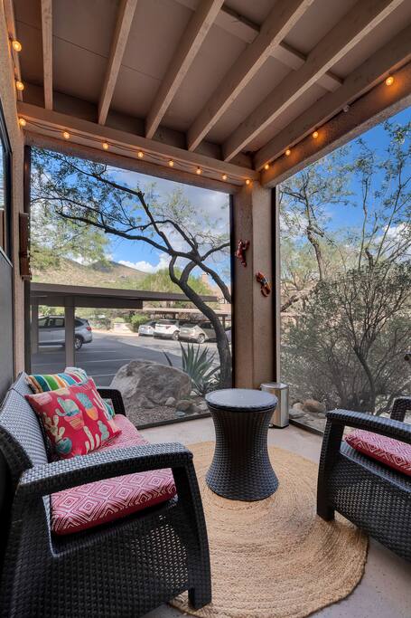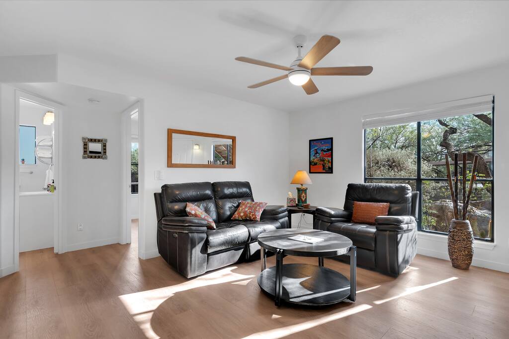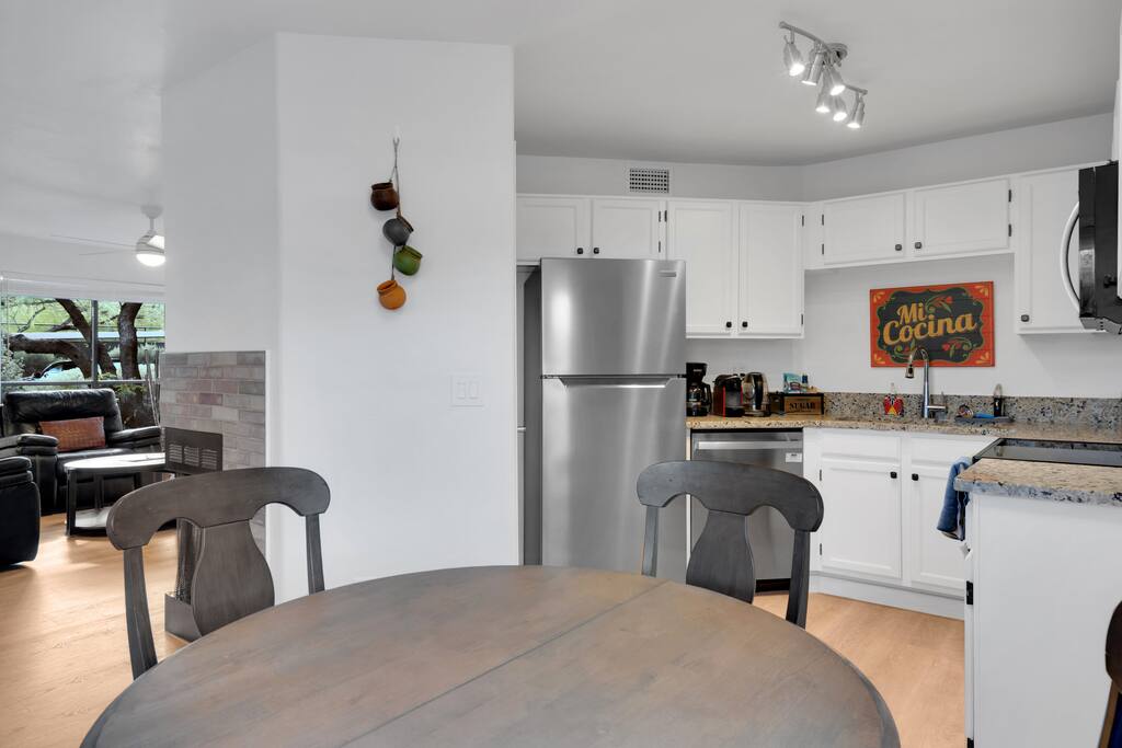 Welcome to Sonoran Oasis Experience tranquility in this beautifully remodeled 911 sq. ft. ground-level condo featuring Southwest-inspired décor, mountain views, and modern comforts. Living Room • Power-reclining leather loveseat and chair for ultimate comfort. • 55″ 4K Roku Smart TV with free YouTube TV subscription. • Fast Xfinity Wi-Fi and Ecobee-controlled HVAC for personalized comfort. Primary Bedroom & Bath • King bed with hotel-quality linens and a cozy Southwestern quilt. • 43″ Smart Roku TV and ceiling fan for comfort. • Walk-in closet and private ensuite with granite double vanity and rainfall shower. Guest Bedroom & Bath • Queen bed with premium linens and ceiling fan. • 40″ Smart Roku TV for streaming your favorite shows. • Spacious closet and private bath with rainfall shower. Kitchen • Fully equipped with stainless steel refrigerator, glass cooktop, standard oven, and dishwasher. • Coffee options include Nespresso and 12-cup drip maker, plus blender, toaster, and cookware. • Stocked with essentials and utensils for convenient at-home dining. Extras • Brand-new Whirlpool washer and dryer with detergent and softener provided. • Screened-in Arizona Room with mountain views — perfect for reading or relaxing in the evening. Community Amenities • Two heated pools, whirlpool spas, fitness center, and lighted tennis/pickleball court. • Private gated access to the Ventana Canyon hiking trail for scenic walks and wildlife viewing. Convenience Nearby • Many local restaurants, coffee shops, and grocery options just minutes away. • Close to Loews Ventana Canyon Resort for golf and fine dining, Sabino Canyon for hiking, and upscale shopping in Tucson.