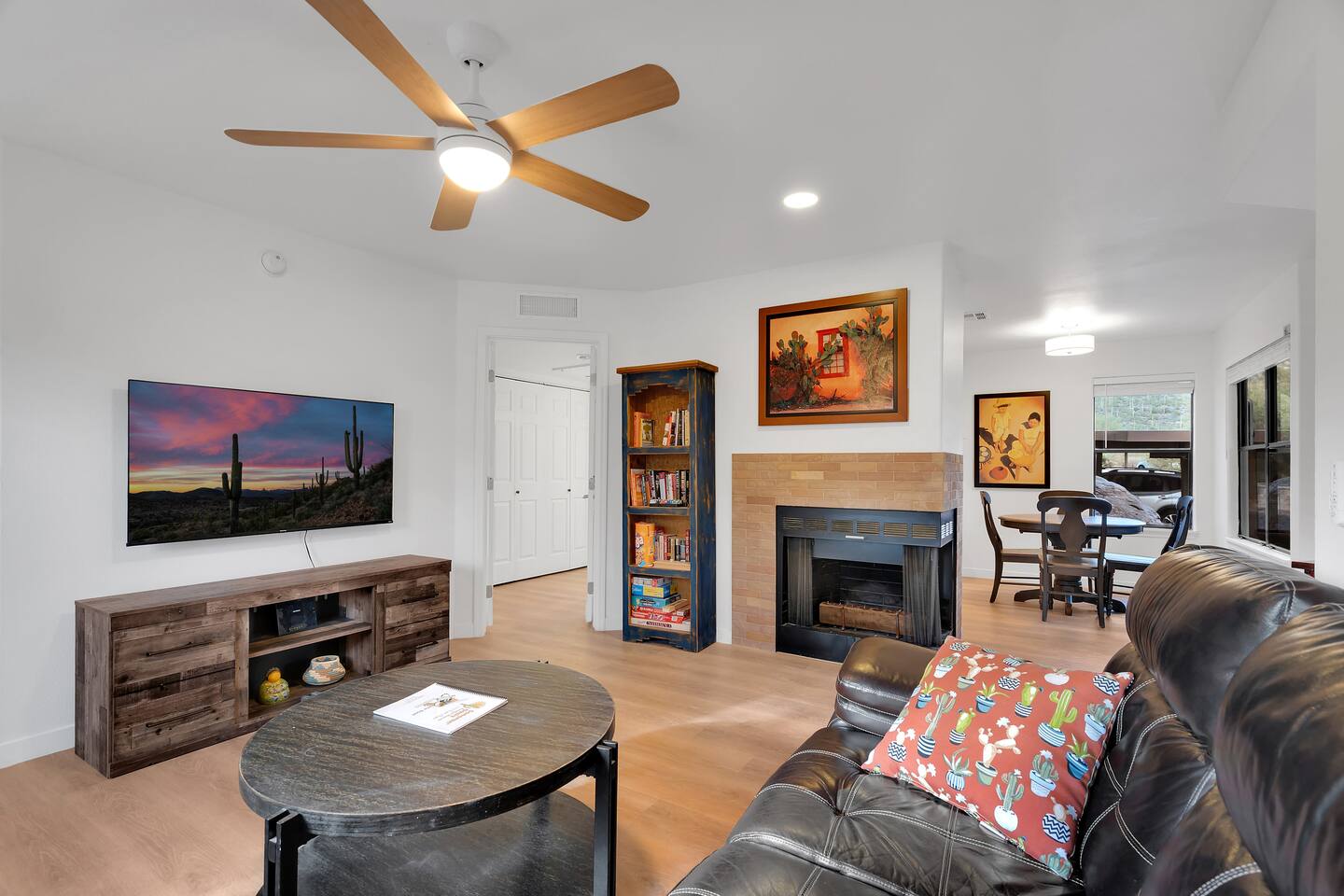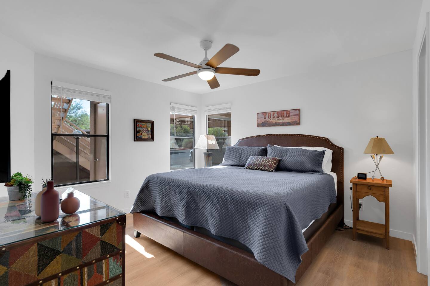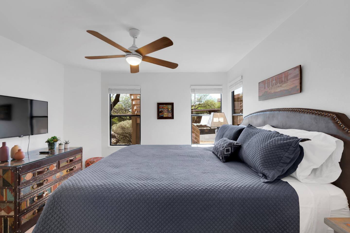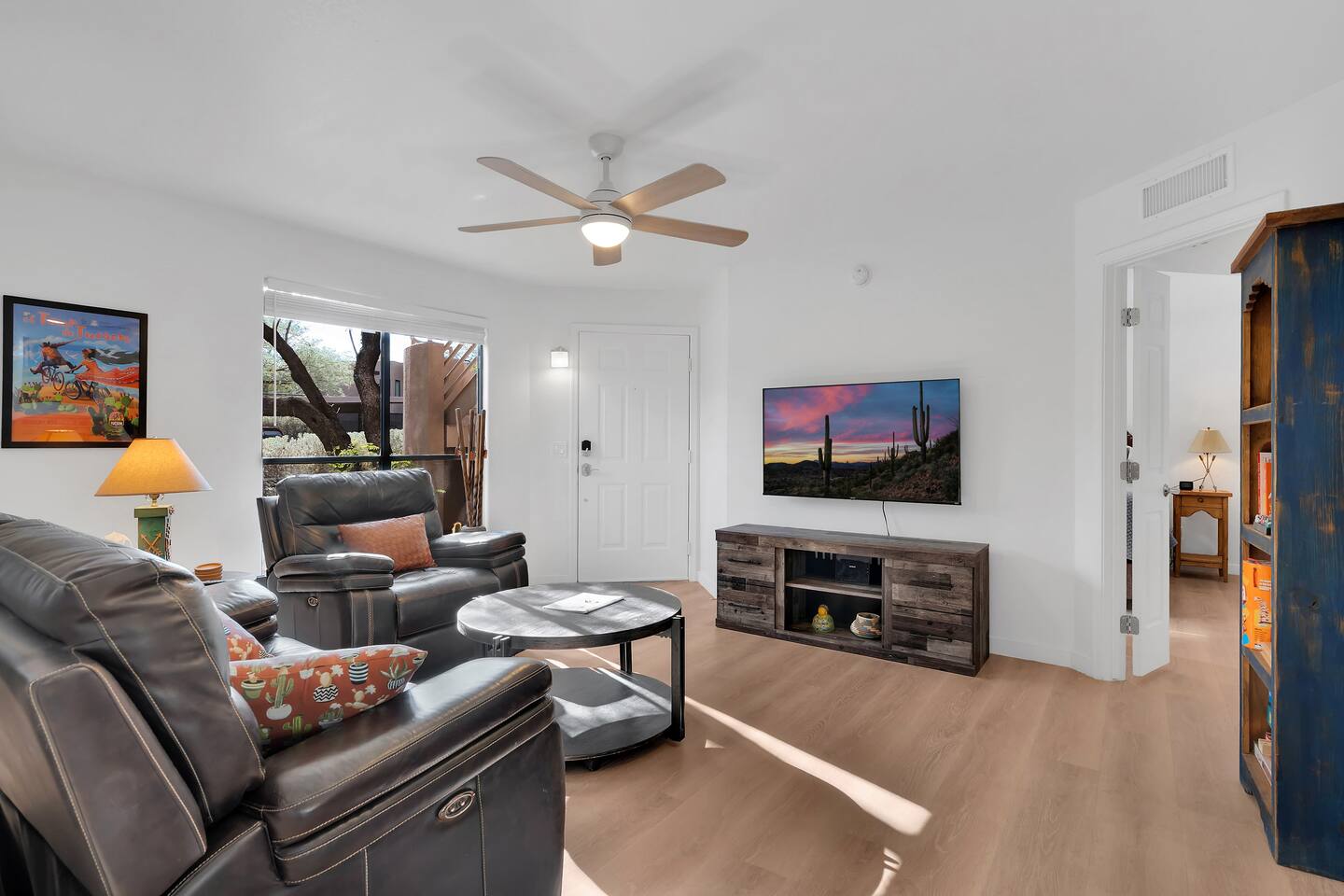 Welcome to Sonoran Oasis Experience tranquility in this beautifully remodeled 911 sq. ft. ground-level condo featuring Southwest-inspired décor, mountain views, and modern comforts. Living Room • Power-reclining leather loveseat and chair for ultimate comfort. • 55″ 4K Roku Smart TV with free YouTube TV subscription. • Fast Xfinity Wi-Fi and Ecobee-controlled HVAC for personalized comfort. Primary Bedroom & Bath • King bed with hotel-quality linens and a cozy Southwestern quilt. • 43″ Smart Roku TV and ceiling fan for comfort. • Walk-in closet and private ensuite with granite double vanity and rainfall shower. Guest Bedroom & Bath • Queen bed with premium linens and ceiling fan. • 40″ Smart Roku TV for streaming your favorite shows. • Spacious closet and private bath with rainfall shower. Kitchen • Fully equipped with stainless steel refrigerator, glass cooktop, standard oven, and dishwasher. • Coffee options include Nespresso and 12-cup drip maker, plus blender, toaster, and cookware. • Stocked with essentials and utensils for convenient at-home dining. Extras • Brand-new Whirlpool washer and dryer with detergent and softener provided. • Screened-in Arizona Room with mountain views — perfect for reading or relaxing in the evening. Community Amenities • Two heated pools, whirlpool spas, fitness center, and lighted tennis/pickleball court. • Private gated access to the Ventana Canyon hiking trail for scenic walks and wildlife viewing. Convenience Nearby • Many local restaurants, coffee shops, and grocery options just minutes away. • Close to Loews Ventana Canyon Resort for golf and fine dining, Sabino Canyon for hiking, and upscale shopping in Tucson.