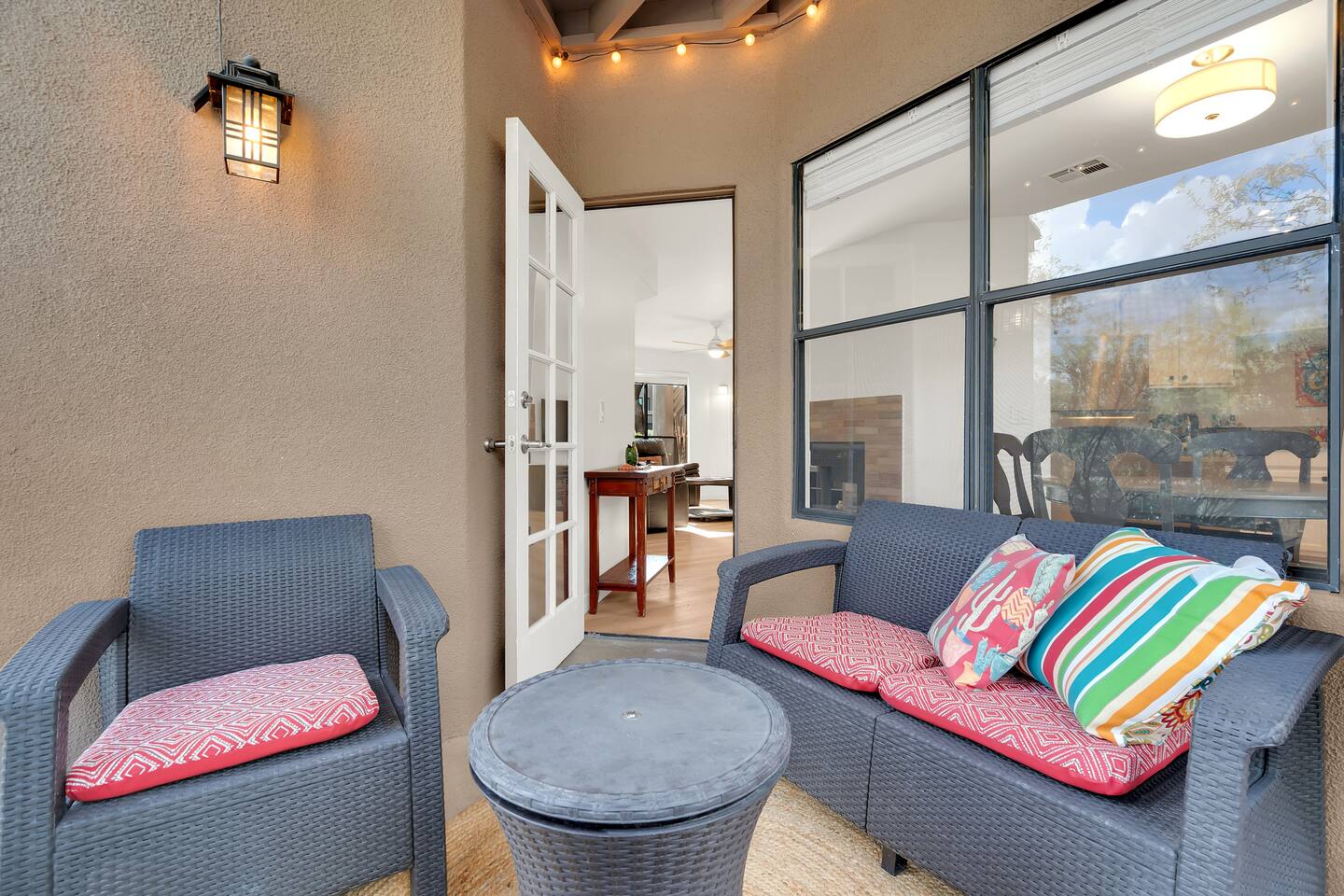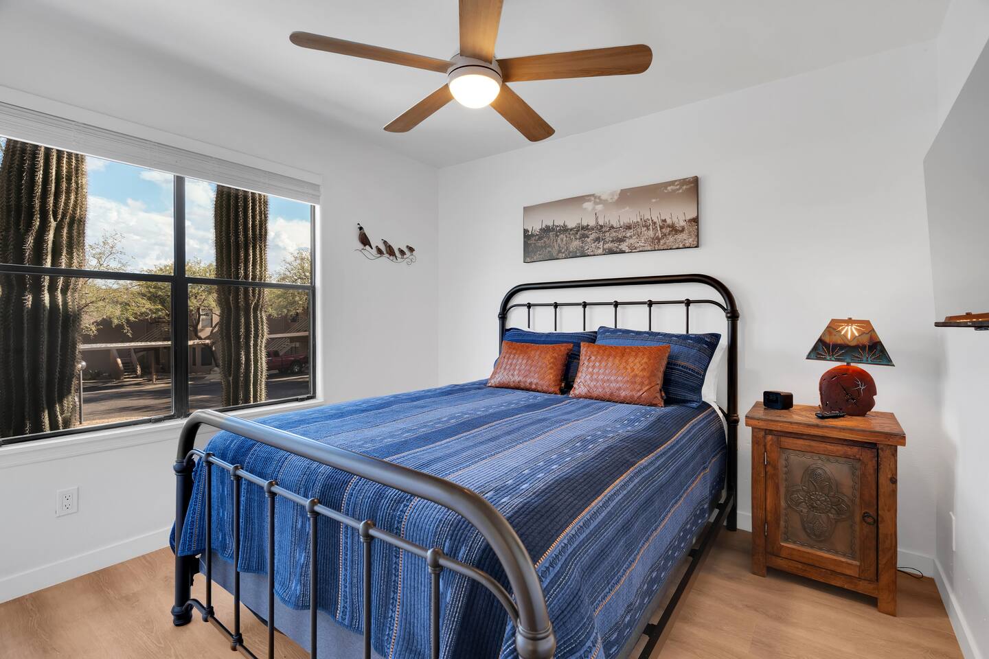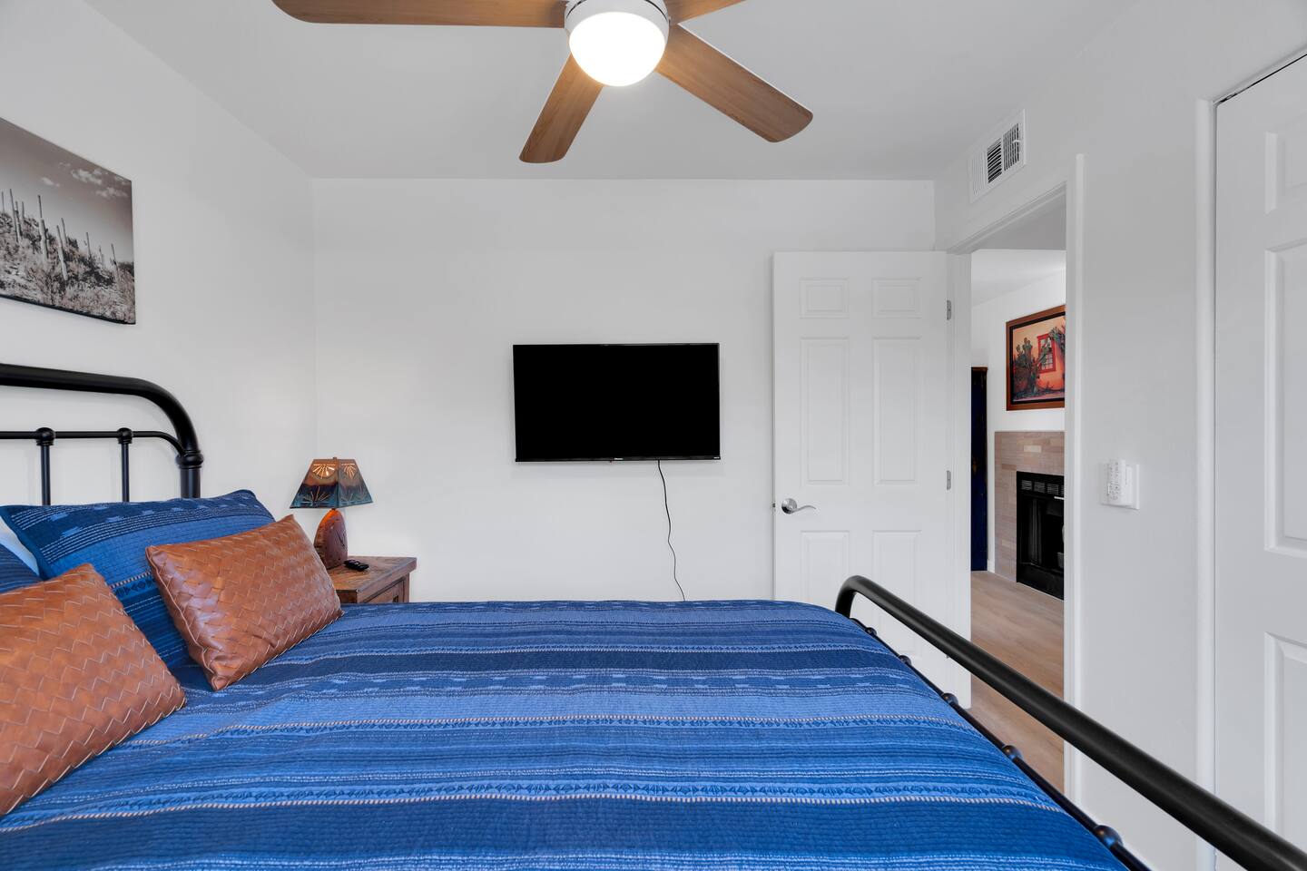 Welcome to Sonoran Oasis Experience tranquility in this beautifully remodeled 911 sq. ft. ground-level condo featuring Southwest-inspired décor, mountain views, and modern comforts. Living Room • Power-reclining leather loveseat and chair for ultimate comfort. • 55″ 4K Roku Smart TV with free YouTube TV subscription. • Fast Xfinity Wi-Fi and Ecobee-controlled HVAC for personalized comfort. Primary Bedroom & Bath • King bed with hotel-quality linens and a cozy Southwestern quilt. • 43″ Smart Roku TV and ceiling fan for comfort. • Walk-in closet and private ensuite with granite double vanity and rainfall shower. Guest Bedroom & Bath • Queen bed with premium linens and ceiling fan. • 40″ Smart Roku TV for streaming your favorite shows. • Spacious closet and private bath with rainfall shower. Kitchen • Fully equipped with stainless steel refrigerator, glass cooktop, standard oven, and dishwasher. • Coffee options include Nespresso and 12-cup drip maker, plus blender, toaster, and cookware. • Stocked with essentials and utensils for convenient at-home dining. Extras • Brand-new Whirlpool washer and dryer with detergent and softener provided. • Screened-in Arizona Room with mountain views — perfect for reading or relaxing in the evening. Community Amenities • Two heated pools, whirlpool spas, fitness center, and lighted tennis/pickleball court. • Private gated access to the Ventana Canyon hiking trail for scenic walks and wildlife viewing. Convenience Nearby • Many local restaurants, coffee shops, and grocery options just minutes away. • Close to Loews Ventana Canyon Resort for golf and fine dining, Sabino Canyon for hiking, and upscale shopping in Tucson.
